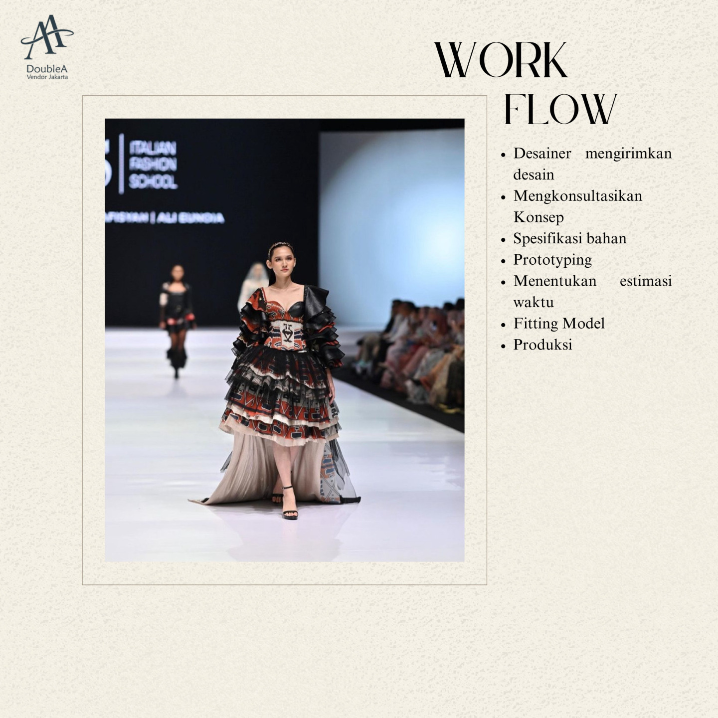 Double A Konveksi bisa bekerjasama dengan designer untuk mewujudkan rancangan ide desain yang disalurkan untuk peragaan busana, pameran dll.