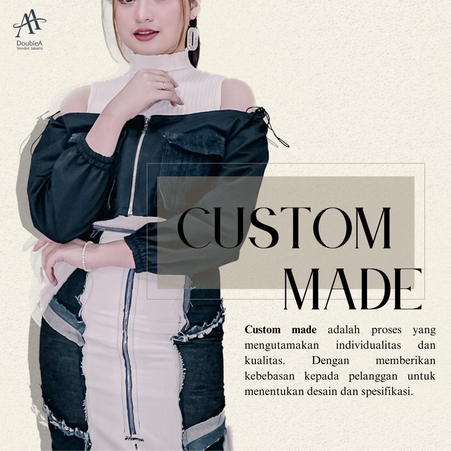 Wujudkan desain pakaian impian Anda! Layanan custom made kami siap menerima pesanan pakaian sesuai keinginan Anda, mulai dari model, bahan, warna, hingga ukuran.