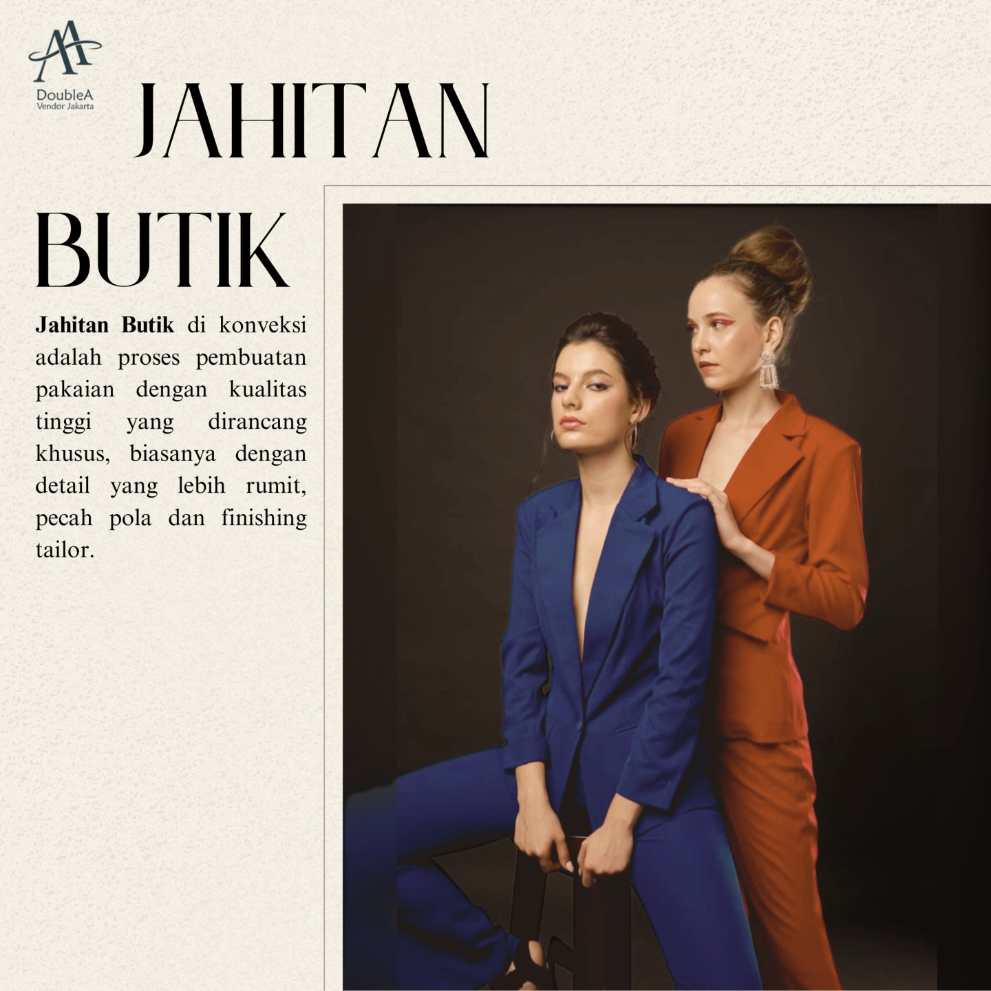 Ingin pakaian dengan kualitas jahitan terbaik? Percayakan pada kami! Tim penjahit profesional kami akan menghasilkan pakaian dengan detail jahitan yang rapi, presisi, dan berkualitas tinggi layaknya jahitan butik ternama.